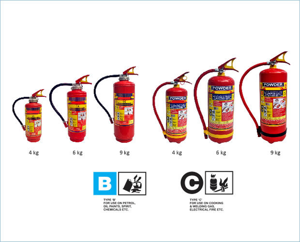 Powder fire extinguishers are ideal for use on Class, B and C Fire Risks. The SAFE PRO Powder fire extinguishers are available in 4kg, 6kg and 9kg standard versions. This model is designed to extinguish ‘B’ and ‘C’ type fires involving material like Petro Chemical products, Paints, Resins, Pigment, Varnish, Gases in the compressed form like Oxygen, Acetylene, LPG, & CNG.